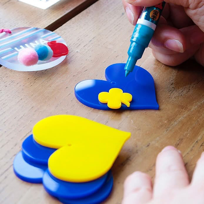 様々なカタチとカラーのアクリル板をご用意します。お好きなアクリル板を選んで、お名前や絵を書いて自分だけのオリジナルキーホルダーが作れます。