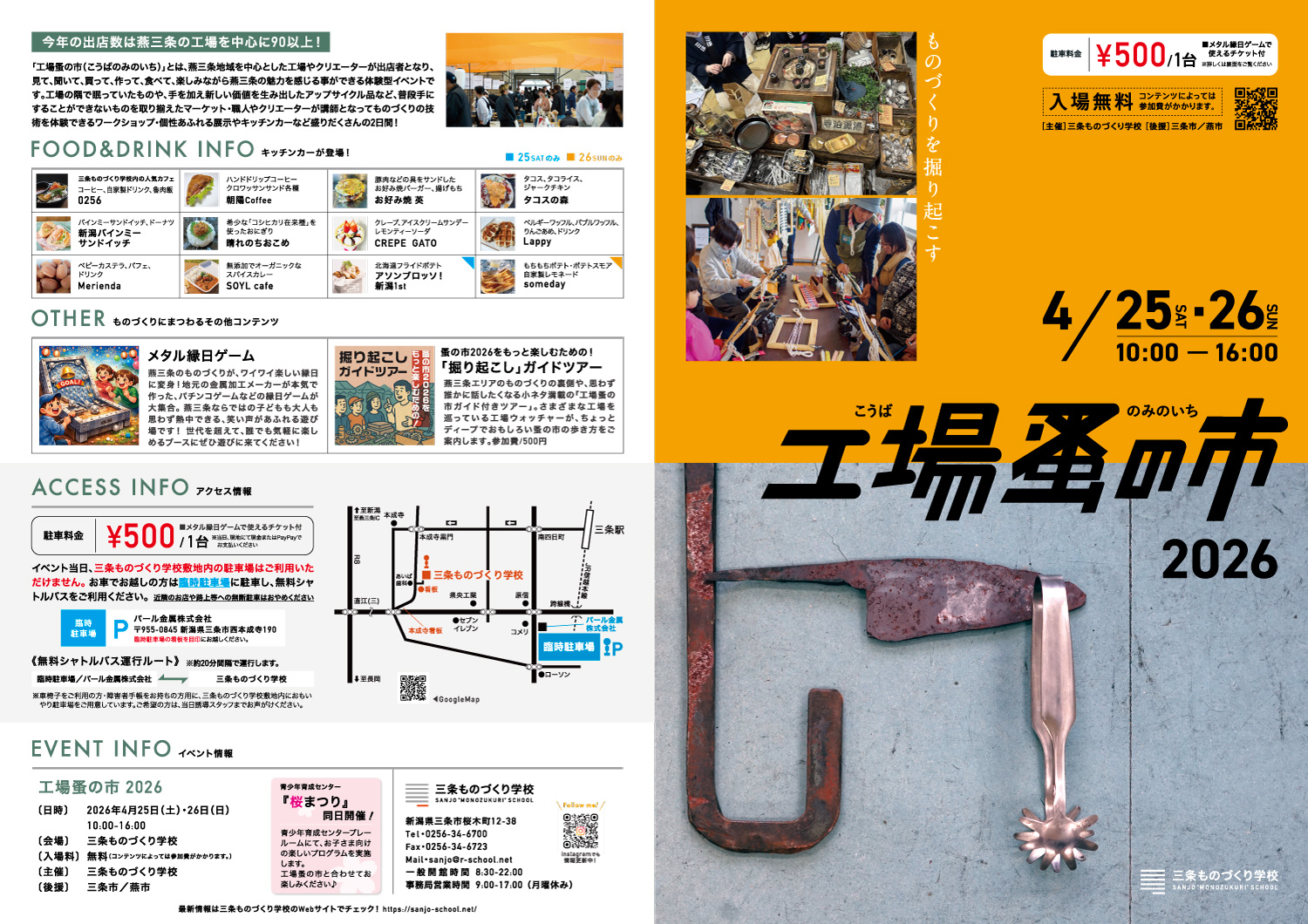 “工場蚤の市”は燕三条地域を中心とした工場やクリエーターが出店者となり、見て、聞いて、買って、作って、食べて、楽しみながら燕三条の魅力を感じる事ができる体験型イベントです。これから開催までの間、Webサイトを中心にイベント情報を更新していきます。
